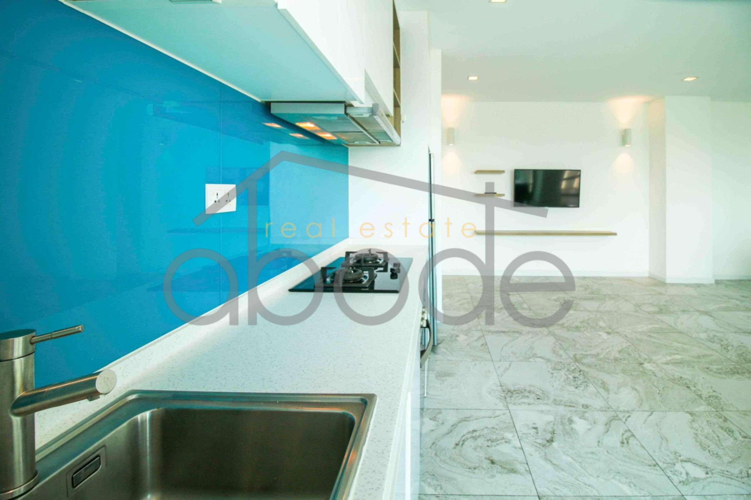 This modern apartment has been designed with style and practicality in mind. The open-plan kitchen, dining and living space features polished marble-effect tiled floors, a sleek European-style kitchen with a gas hob, electric oven, integrated range hood and full-height blue glass splashback, plus a stainless steel refrigerator and Samsung washing machine. A wall-mounted flat-screen TV, quality furnishings and air conditioning complete the living space.